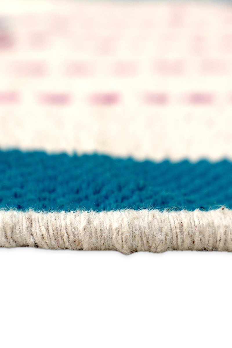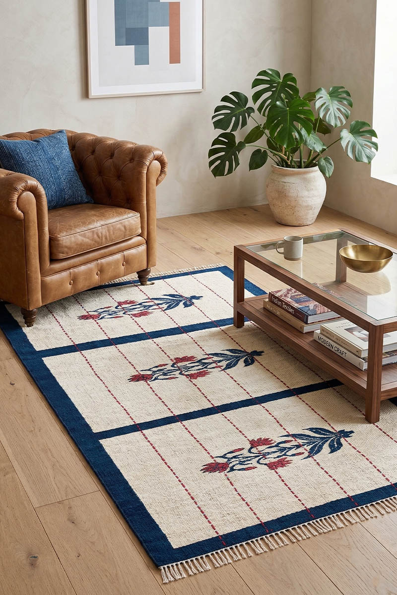 Bring the elegance of nature into your abode with the elegant flora pattern of our Gorgeous Floral Rug. An ingenious blend of history and modernity, this rug boasts of three exquisite plant patterns that are framed in a majestic blue color. The stark juxtaposition between the rich navy blue edges and the soft off-white panels is complemented with vertical lines of intricate red Kantha hand-stitching. Our Modern Boho Dhurrie rug acts as an elegant centerpiece for master suites, formal dining rooms, or modern entrances.